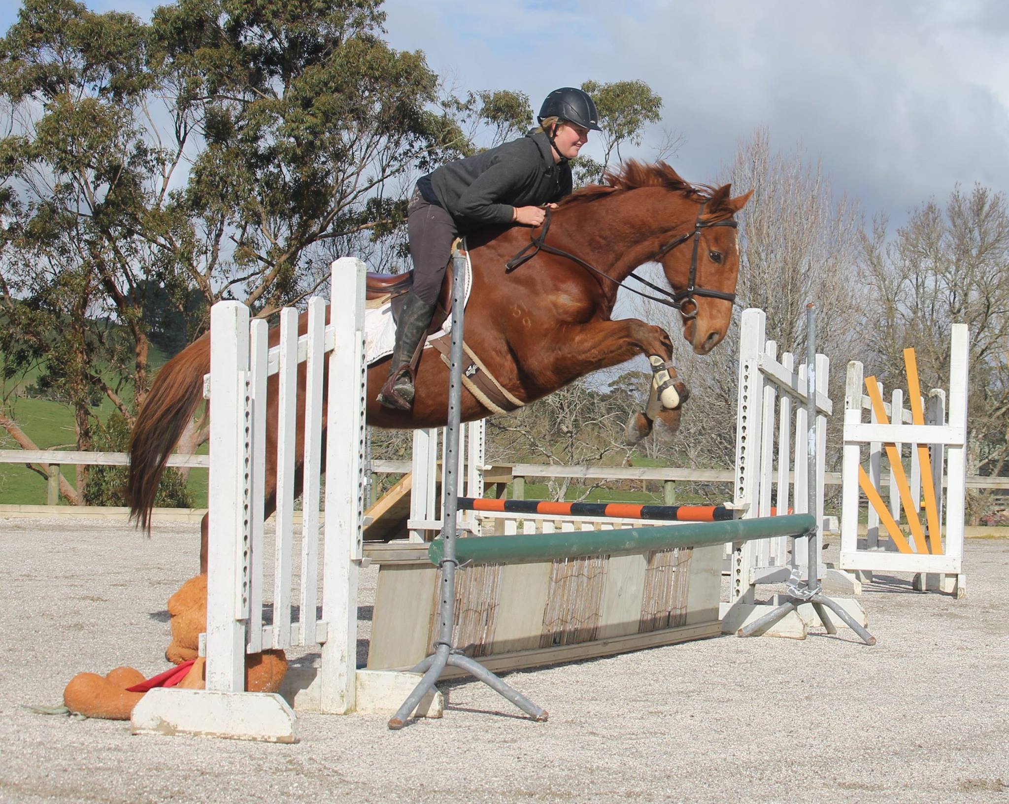 This interesting looking chap is Teddy! Teddy is an 8yr old 16.0hh (chunky and big) TB gelding with unfortunate looks but a great personality. He has had some good basic schooling along the way, has a lovely mouth and very cute tidy jump, slow and quiet for both flat work and jumping. He has been on many treks and big forest and farm rides with groups of horses, awesome and quiet, happy to get left behind, great to canter down the beach and bush bash on, a real man! Not winning any beauty contests but has nice clean legs and has been in full work treking barefoot.